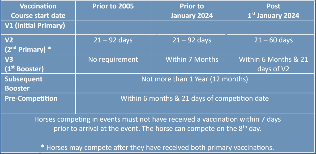 Horses who had their primary course of vaccinations prior to January 2024 do not need to restart.