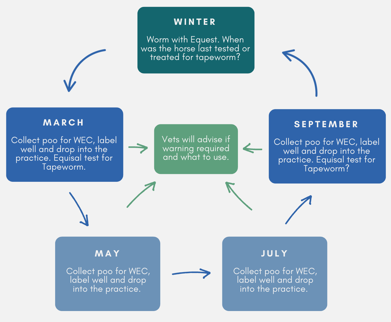 To avoid the spread of resistance we strongly recommend the use of WECs to detect which horses actually need worming. 80% of horses do not need worming during the Spring and Summer months. WECs are not useful over winter months as the small redworm encyst in the gut wall inside the horse and are therefore not producing eggs detectable in the poo. We recommend WECs are done every 2-3 months from March to October depending on risk and history. If a horse has a very high WEC result, we may recommend repeating the WEC 2 weeks after worming to ensure it has been effective.